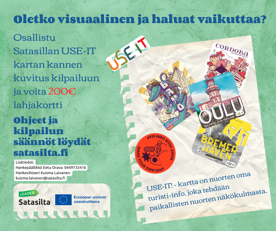 Oletko 15-28 vuotias? Osallistu Satasillan USE-IT kartan kannen kuvituskilpailuun! Piirrä tai muuten suunnittele USE-IT kartallemme kansikuva ja lähetä se meille osoitteeseen eetu.orava@satasilta.fi Kuva tulee olla 13.5cm leveä ja 13.5cm korkea ja